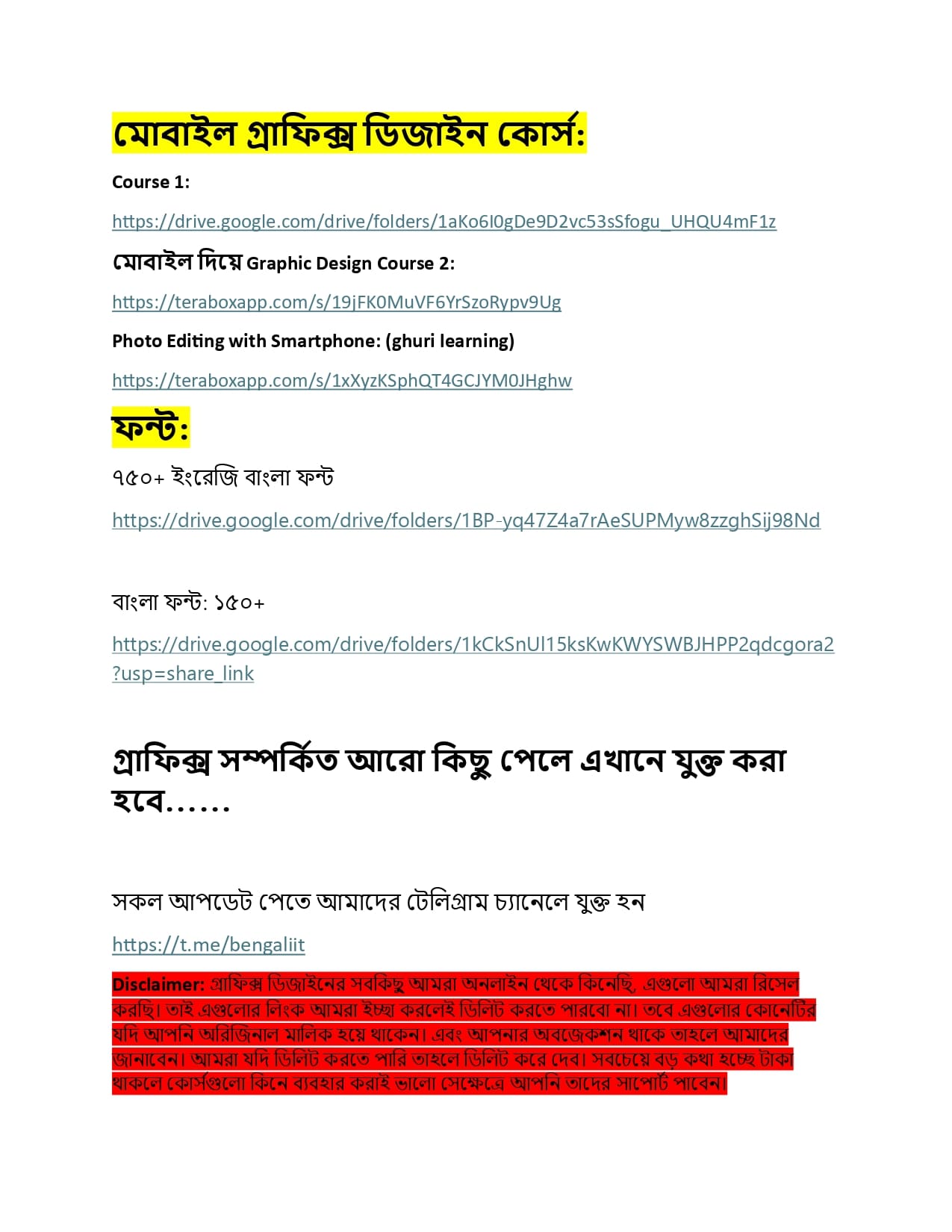 🛑🛑🛑 Disclaimer: গ্রাফিক্স ডিজাইনের সবকিছু আমরা অনলাইন থেকে কিনেছি, এগুলো আমরা রিসেল করছি। তাই এগুলোর লিংক আমরা ইচ্ছা করলেই ডিলিট করতে পারবো না। তবে এগুলোর কোনেটির যদি আপনি অরিজিনাল মালিক হয়ে থাকেন। এবং আপনার অবজেকশন থাকে তাহলে আমাদের জানাবেন। আমরা যদি ডিলিট করতে পারি তাহলে ডিলিট করে দেব। সবচেয়ে বড় কথা হচ্ছে টাকা থাকলে কোর্সগুলো কিনে ব্যবহার করাই ভালো সেক্ষেত্রে আপনি তাদের সাপোর্ট পাবেন। 🛑🛑🛑
